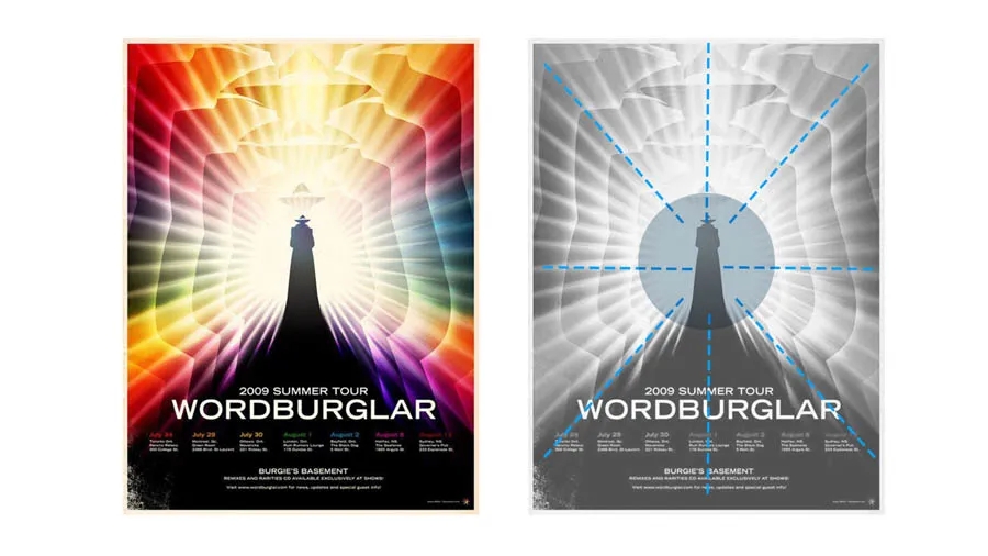文案擺放在版面的對(duì)角線方向,一方面避免了司空見慣的居中版面,一方面給中心主體留出了更多的創(chuàng)作空間;另外中心的圖形也可以是對(duì)角線的設(shè)計(jì),這樣會(huì)讓整個(gè)構(gòu)圖看起來比較平衡。