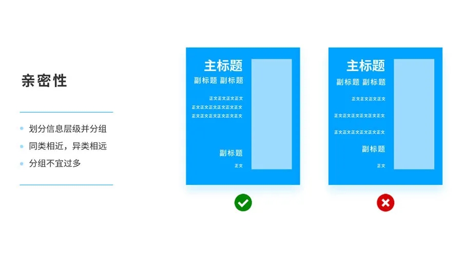 同類相近,異類相遠,相關(guān)的元素距離靠近,歸組在一起,成為一個視覺單位,而不是多個孤立分散的狀態(tài),這樣有助于組織信息,減少混亂,讓結(jié)構(gòu)變得更清晰。根據(jù)文案內(nèi)容,進行合理的分組和歸類。
