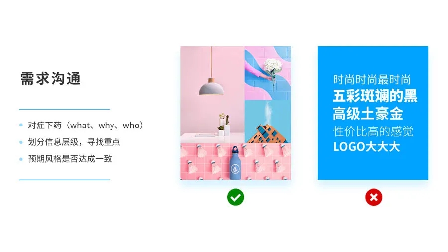 Ps:關(guān)于第3步風(fēng)格溝通,建議雙方用圖片交流和表達(dá)。畢竟每個人對“高大上”的理解都是不一樣的,有的人認(rèn)為是五彩斑斕的黑,有人認(rèn)為是大量的留白。