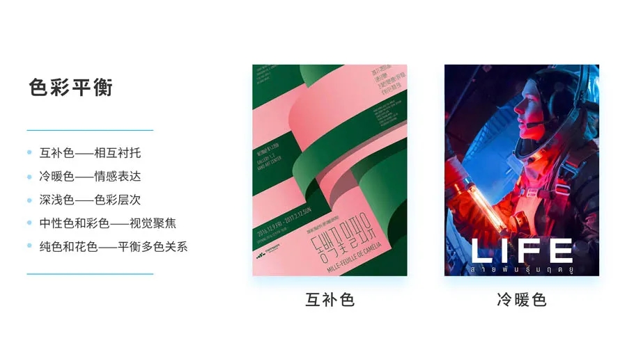 互補(bǔ)色就是色環(huán)上相對的兩個顏色,海報(bào)中的綠色和紅色就是這種關(guān)系,相互映襯,相互襯托,從而達(dá)到了一種平衡。