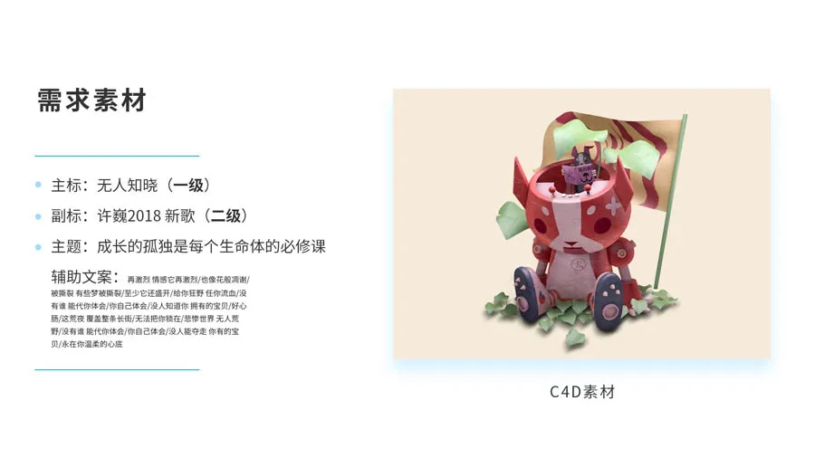 當(dāng)我們的工作內(nèi)容無法滿足做文字比較多的平面海報(bào)的欲望時(shí),可以考慮自命題的練習(xí)。當(dāng)時(shí)聽到許巍《無人知曉》這首新歌的時(shí)候,有一些感悟和想法然后做了一些C4d素材,想利用它作為主體和歌名做一下排版練習(xí):