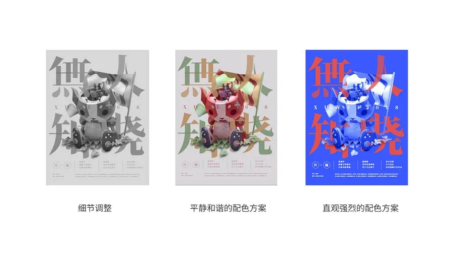 然后調(diào)整主體中4個字和素材之前的交叉和重疊,細(xì)節(jié)調(diào)整后,我嘗試了2個配色方案,一種是利用主體素材的顏色進(jìn)行搭配,平靜和諧;另外一種是紅藍(lán)配色,直觀強(qiáng)烈。