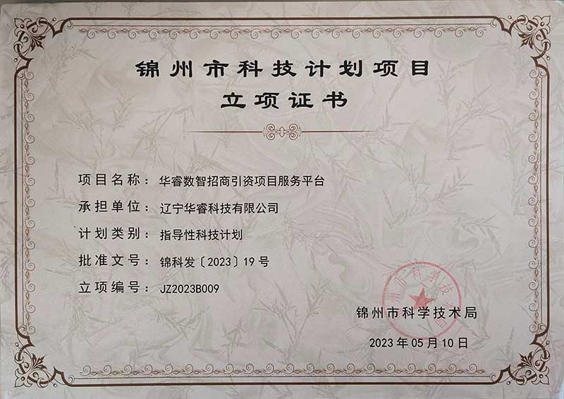 遼寧華睿科技有限公司“華睿數(shù)智招商資項(xiàng)目服務(wù)平臺(tái)”榮獲錦州市科技計(jì)劃項(xiàng)目立項(xiàng)證書。